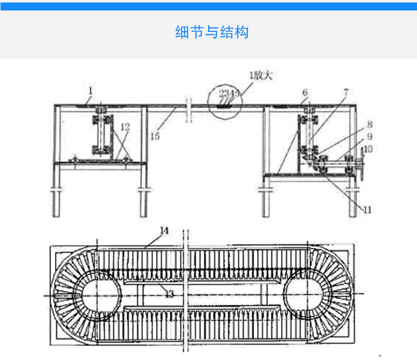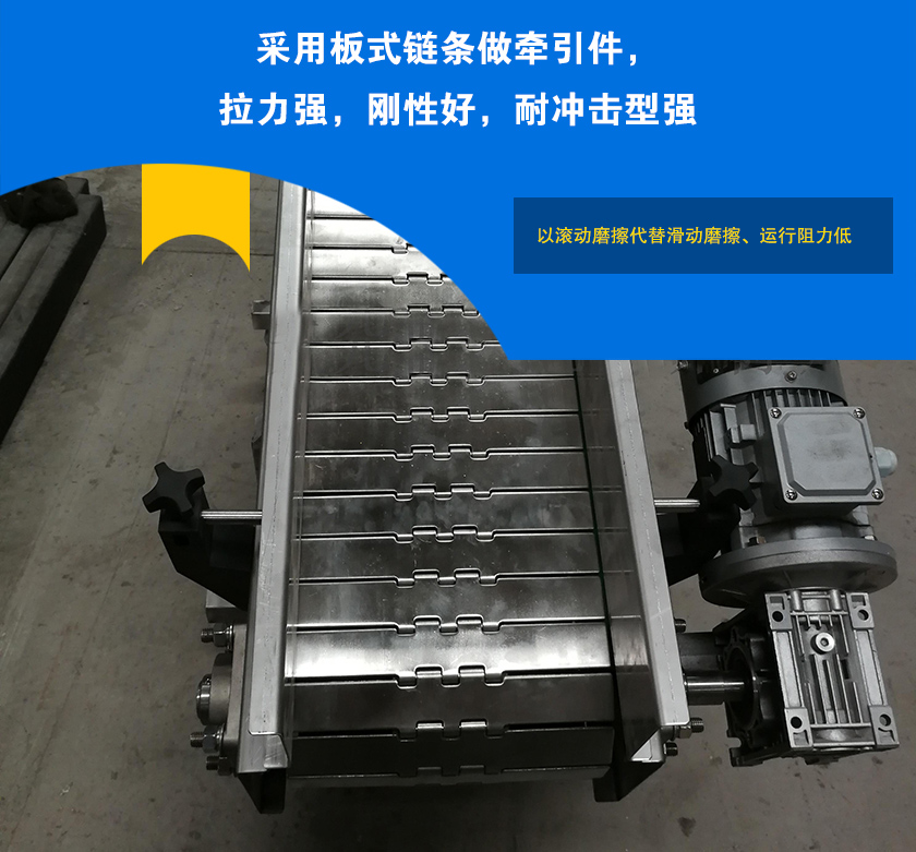 2、采用板式鏈條做牽引件,拉力強,剛性好,耐沖擊型強。
