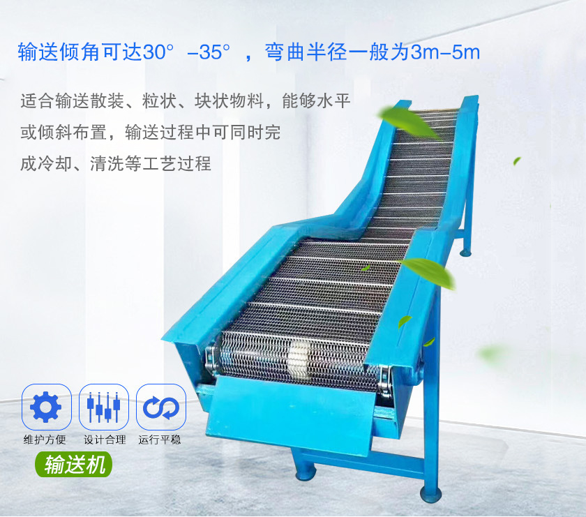 鏈板輸送機采用鏈板輸送帶180°鏈板輸送機用于銜接,與其他輸送設備配合使用能充分節(jié)省空間并能起到良好的輸送效果。轉彎角度可分:60°、90°、180°。可輸送的物料種類繁多,既可輸送各種散料,折彎鏈板輸送機,也可輸送各種紙箱、包裝袋等單件重量不大的件貨,廣泛應用于食品、醫(yī)藥、化工、電力、冶金等行業(yè),適宜輸送600-700℃的高溫物料。