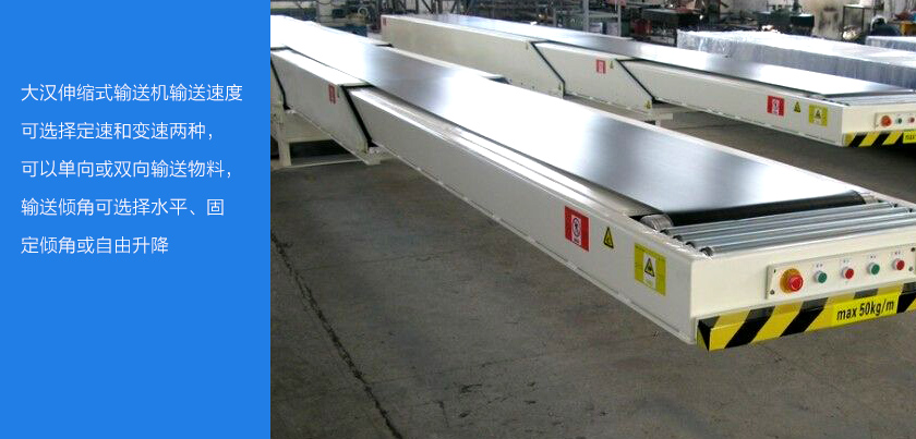 大漢伸縮式輸送機輸送速度可選擇定速和變速兩種,可以單向或雙向輸送物料,輸送傾角可選擇水平、固定傾角或自由升降