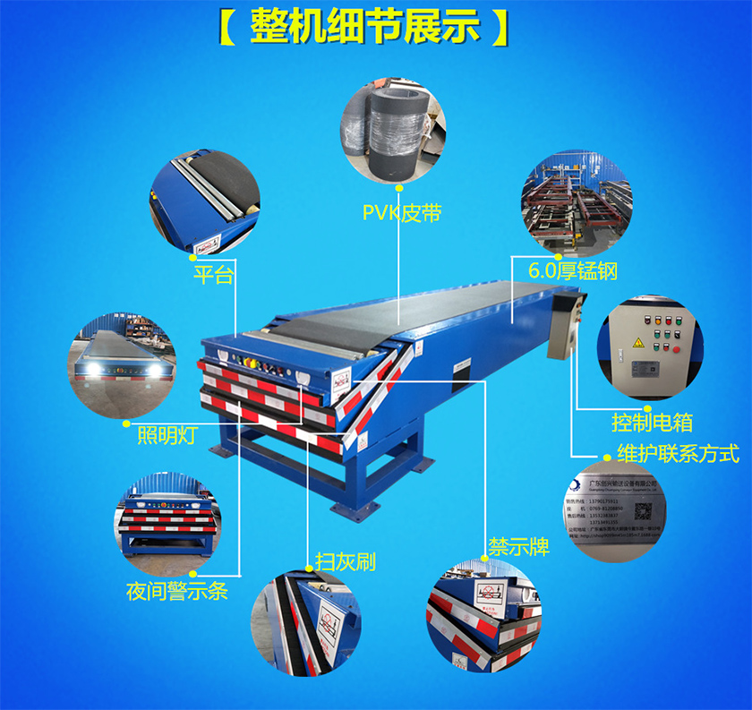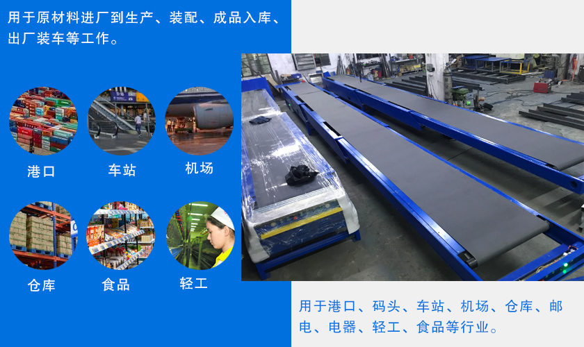 伸縮式皮帶輸送機可應用于港口、碼頭、車站、機場、倉庫、郵電、電器、輕工、食品等行業。完成物品或零件的傳輸,裝卸工作,使用于原材料進廠到生產、裝配、成品入庫、出廠裝車等工作。