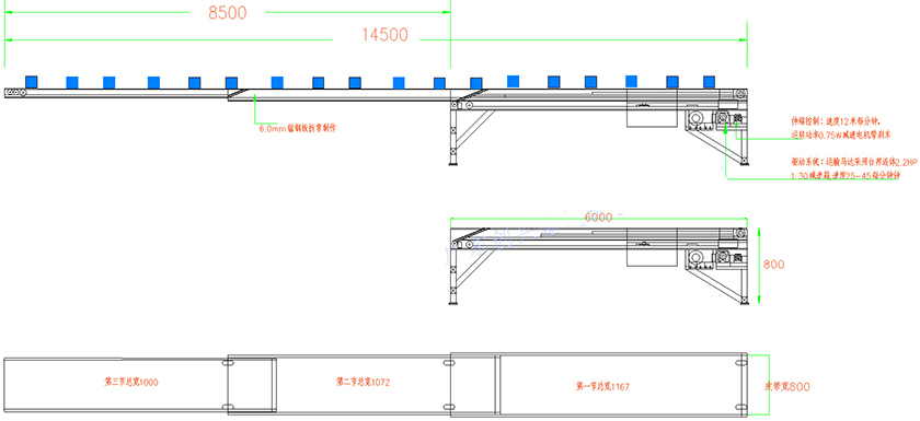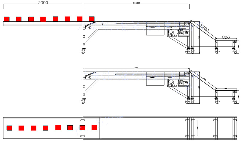 2、可按照用戶要求調節按鈕,隨時控制輸送機的長度,底部安裝升降裝置殼隨時控制輸送機端部的高度。