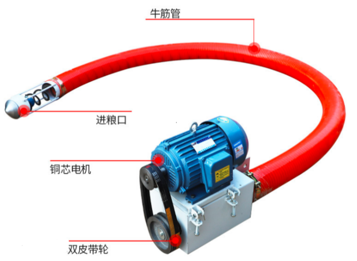 絞龍吸糧機的結(jié)構(gòu)圍繞 吸送順暢、防堵耐磨 設(shè)計,核心由五大部件組成,各部件協(xié)同保障輸送穩(wěn)定。