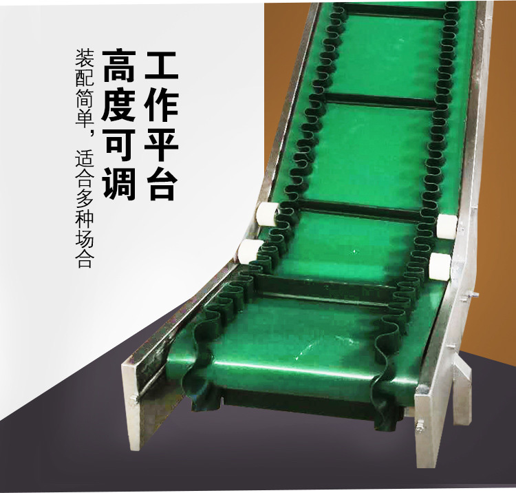 大漢裙邊皮帶輸送機可分橡膠、橡塑、PVC、PU等多種材質,除用于普通物料的輸送外,還可滿足耐油、耐腐蝕、防靜電等有特殊要求物料的輸送。波狀擋邊輸送帶根據覆蓋膠性能不同分為普通型、耐熱型、耐寒型、耐酸堿型、耐油型等。